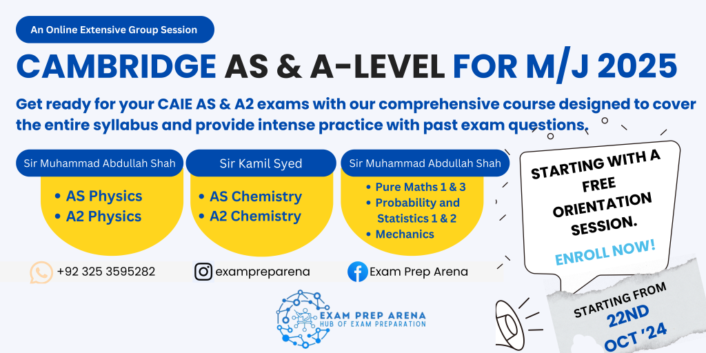 Exampreparena (EPA), under the supervision of Sir Muhammad Abdullah Shah & Sir Kamil Syed, has introduced an Online Extensive Course for A-Level Maths, Physics, and Chemistry for Edexcel IAL January 2025. This course is especially designed for the students who have planned to appear in January 2025 exams and wish to dive in deep to grip the concepts and comprehend the exam attempting technique, including the complete coverage of syllabus and vigorous practice of topical and yearly exam questions for the last 20 years. This course enables students to have hand on all the versions of the questions asked in the exam, focusing on the trend of the questions asked especially after the revision of syllabus in 2018.